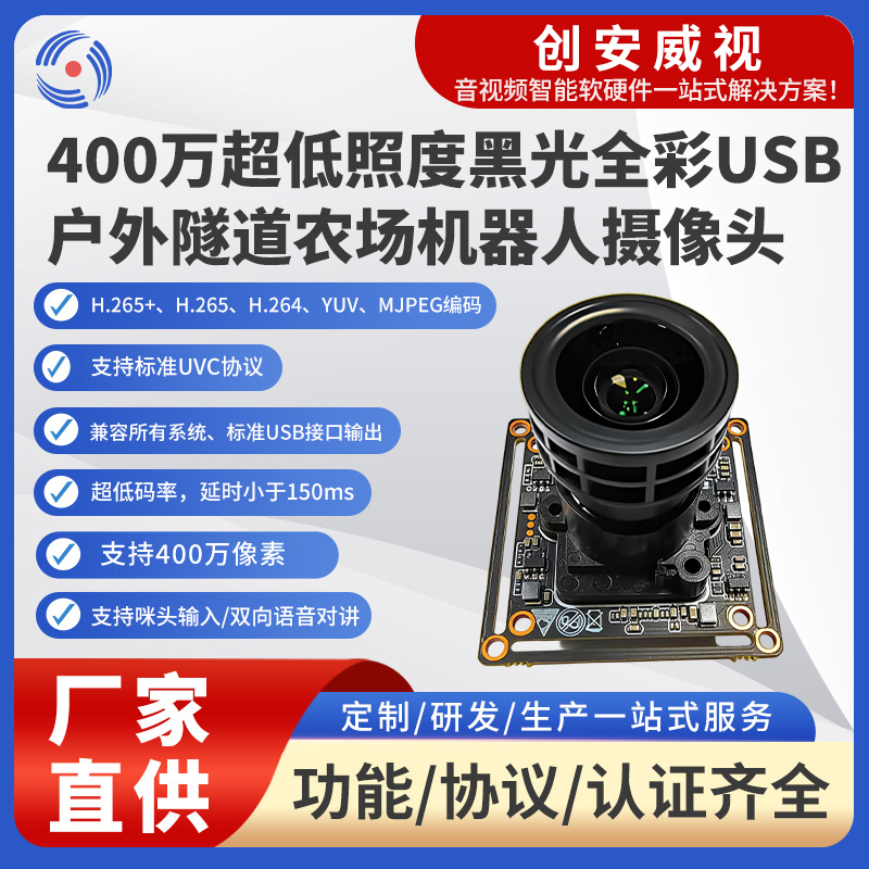 400万黑光全彩、星光夜视、低延时、H.265、支持音频输入、支持定制和二次开发。